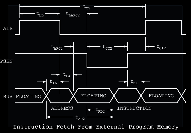 This processor has an interesting Instruction Fetch waveform. I studied this waveform for a couple of hours to determine the best way to interface with the external program memory. I devised that I would need some form of external latch to store the address lines after the bus returned to a floating state. I could use the ALE line to signal when the address was stable and retain that value.